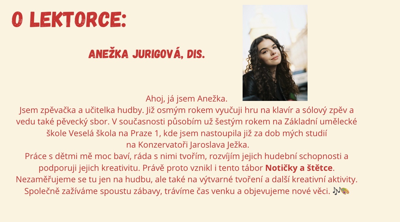 Dopoledne budou patřit tvoření, a to jak hudebnímu, tak výtvarnému. Každé odpoledne nás pak čeká jedna neobvyklá aktivita, za kterou společně vyrazíme do města.
